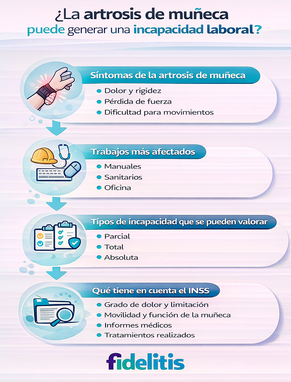Si padeces artrosis de muñeca y te está impidiendo trabajar con normalidad, en Fidelitis podemos ayudarte. Analizamos tu caso y te orientamos sobre si puedes solicitar una incapacidad permanente y cómo hacerlo con garantías.