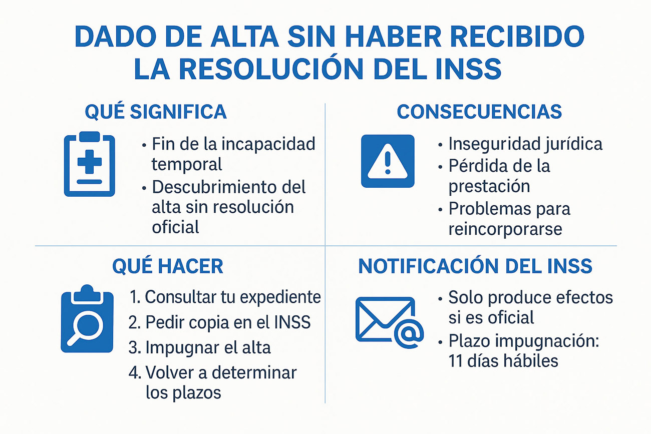 Muchos trabajadores en situación de baja médica se encuentran con una sorpresa desagradable: descubren que el INSS les ha dado el alta sin haber recibido previamente la resolución oficial. Esta situación genera incertidumbre, ya que sin ese documento no hay constancia legal de la decisión ni del plazo para recurrirla. En este artículo te explicamos qué significa, qué consecuencias tiene y qué pasos debes seguir si el INSS te da el alta sin notificación previa.
