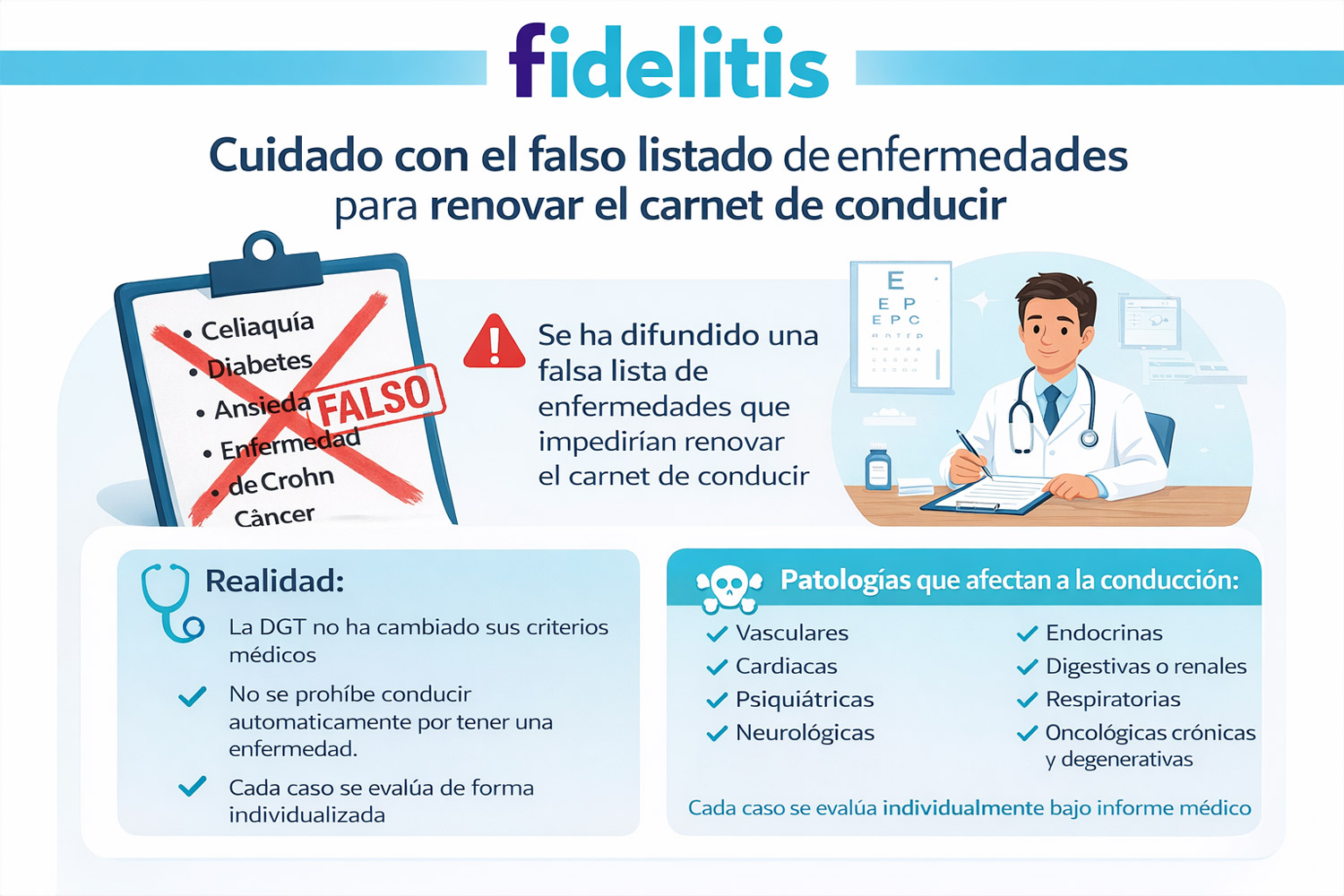 Sin embargo, la DGT ha confirmado que los criterios médicos para conducir no han cambiado desde 1997, por lo que no existe ningún nuevo listado oficial de enfermedades prohibidas para conducir.