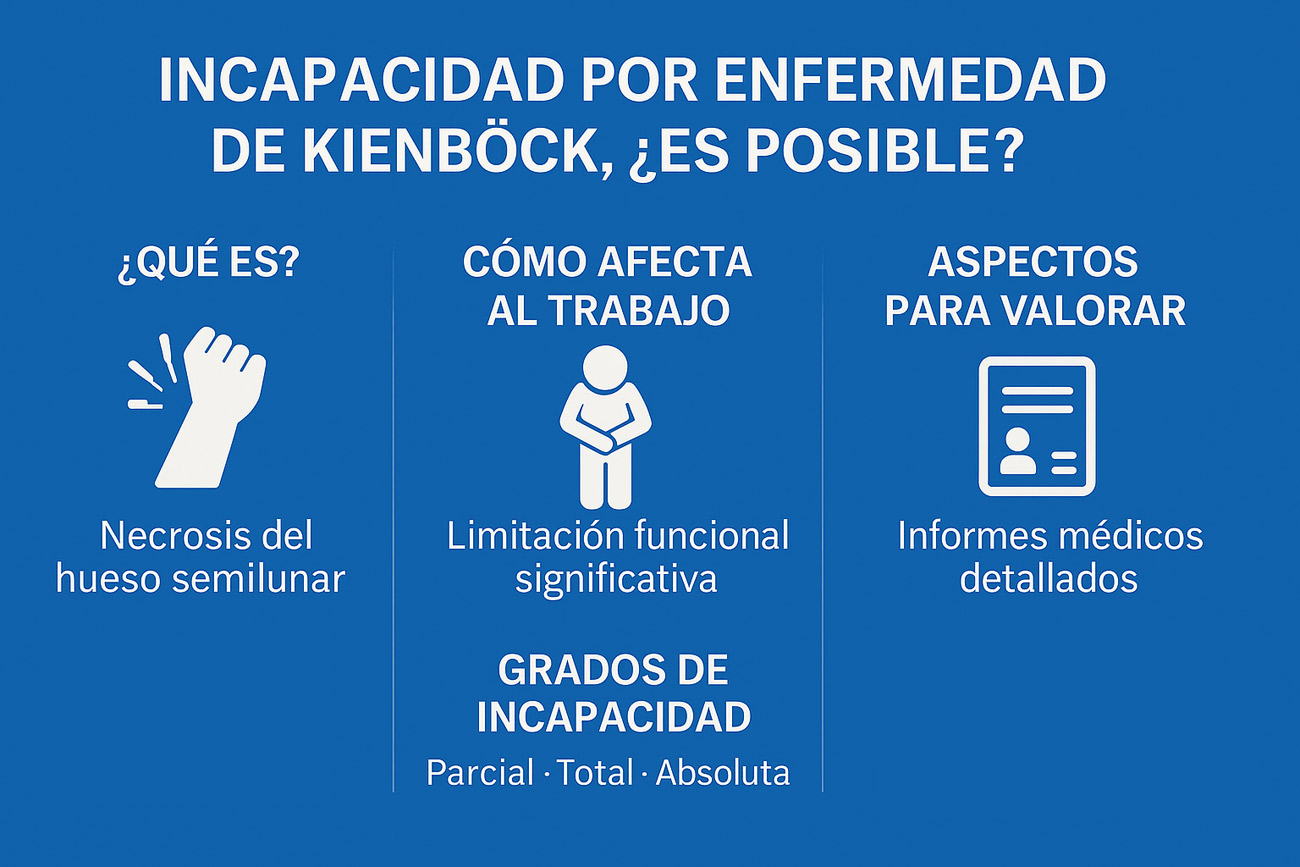 La enfermedad de Kienböck es una patología rara que afecta a los huesos de la muñeca, especialmente al semilunar, y puede provocar dolor intenso, rigidez y pérdida de movilidad. Su evolución puede limitar gravemente la capacidad laboral, sobre todo en profesiones manuales. En este artículo analizamos en qué casos puede reconocerse una incapacidad permanente por enfermedad de Kienböck y qué pasos seguir para solicitarla.