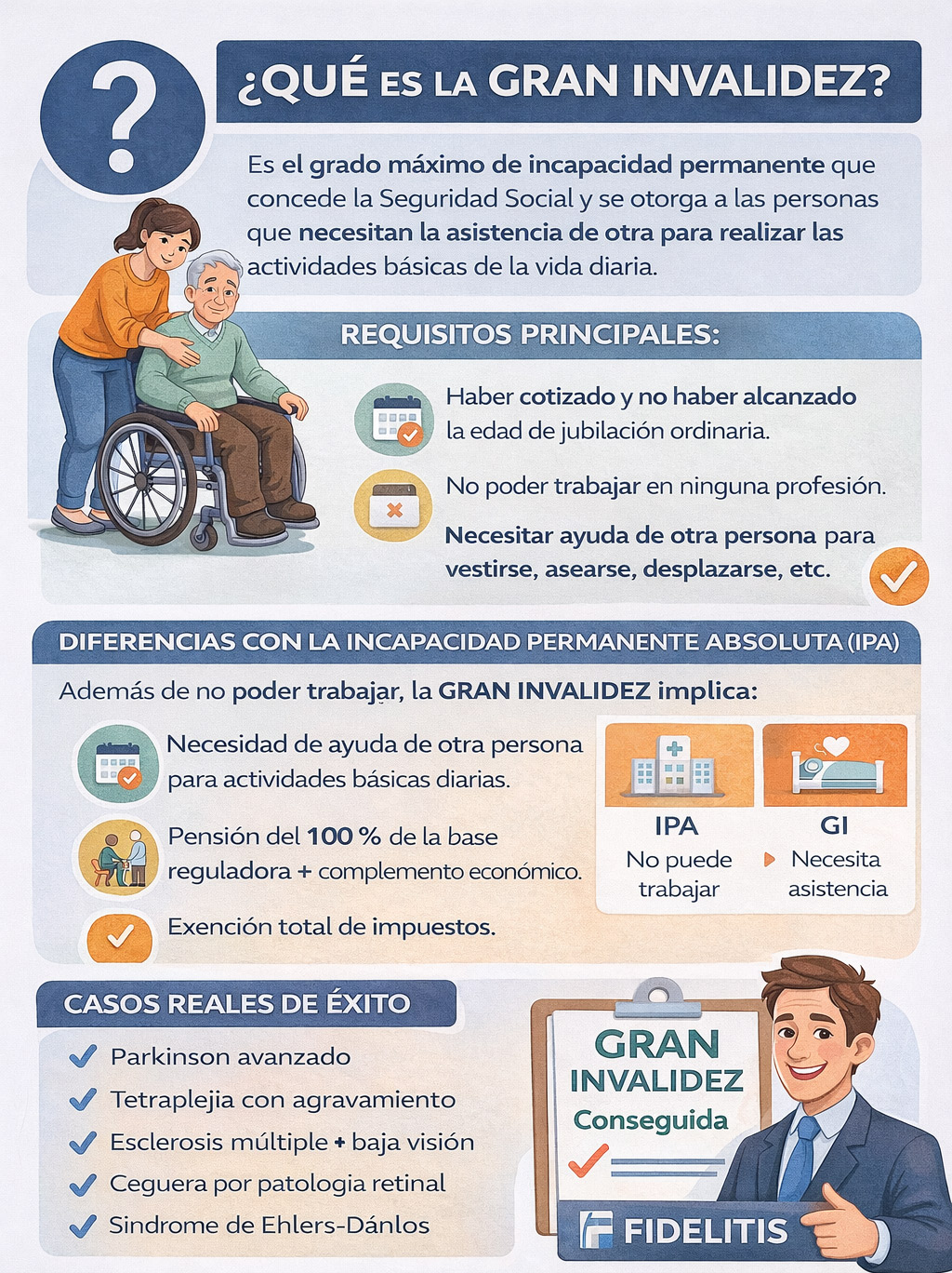 La Gran Invalidez es el grado máximo de incapacidad permanente que reconoce la Seguridad Social, y se concede a los trabajadores que padecen una enfermedad o lesión que les incapacita para realizar cualquier actividad laboral y que además necesitan la ayuda de una tercera persona para realizar los actos cotidianos de la vida diaria.