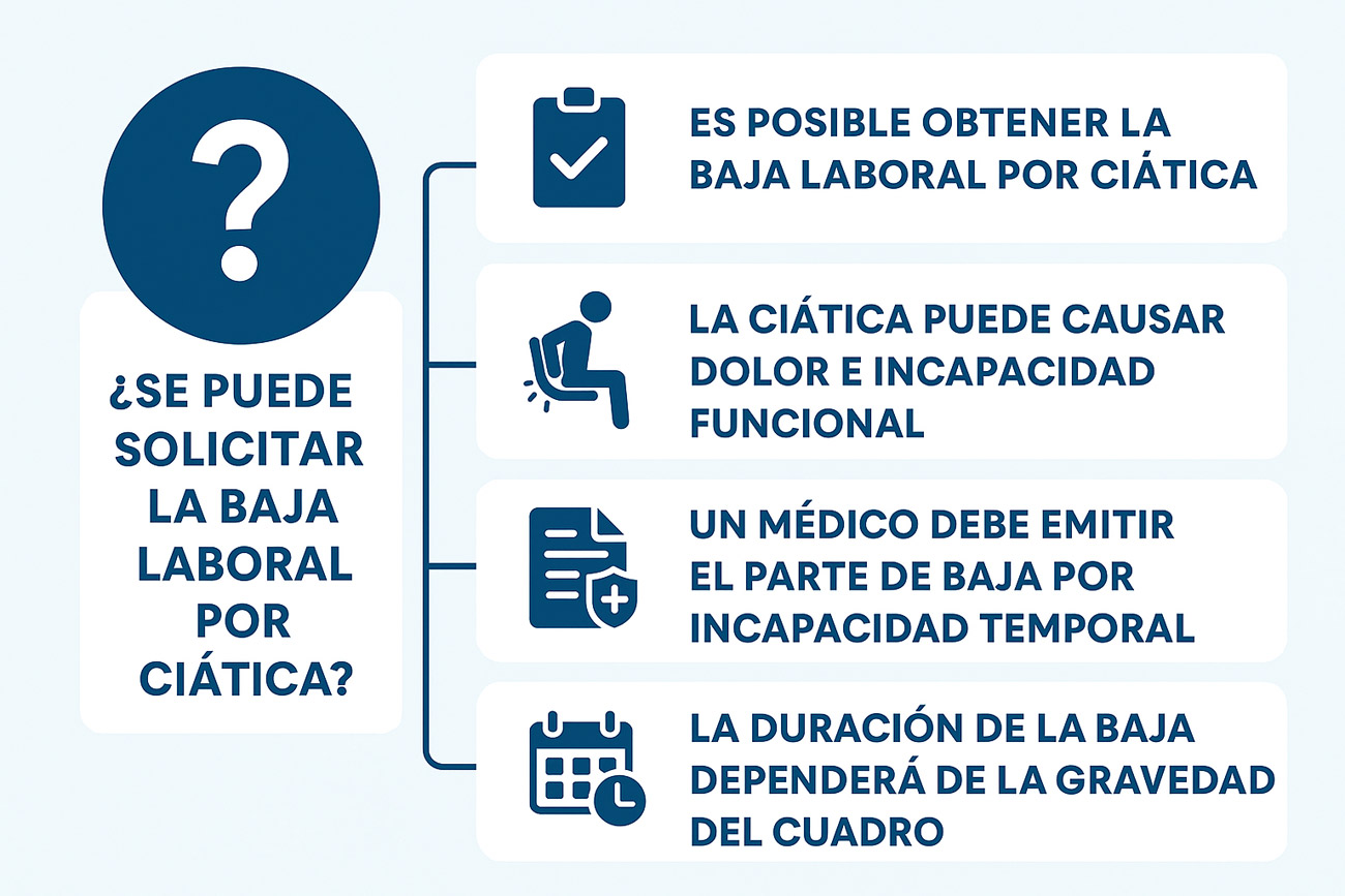 La ciática es una de las causas más frecuentes de baja laboral temporal, especialmente en trabajos que requieren esfuerzo físico, posturas forzadas o permanecer mucho tiempo de pie o sentado. Cuando el dolor es intenso y limita la actividad diaria, sí se puede solicitar la baja laboral.